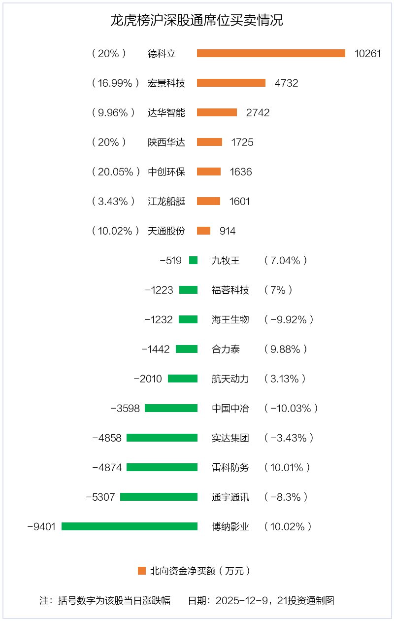 12月9日,北向资金参与龙虎榜中的个股共有17只,合计净卖出1.09亿元。其中沪股通净买入2股,净卖出5股,合计净卖出1031.89万元;深股通净买入5股,净卖出5股,合计净卖出9819.69万元。