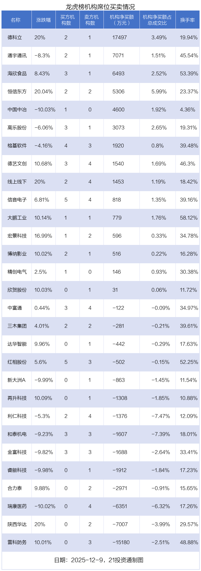 其中,机构净买入金额最多的是德科立(688205.SH),当日收盘上涨20%,换手率为19.94%。
